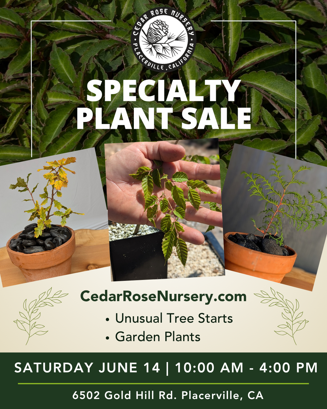 Join us at Cedar Rose Nursery for a specialty plant sale. We've got tree starts & unusual, hard to find plants. We're located on Gold Hill Road.
